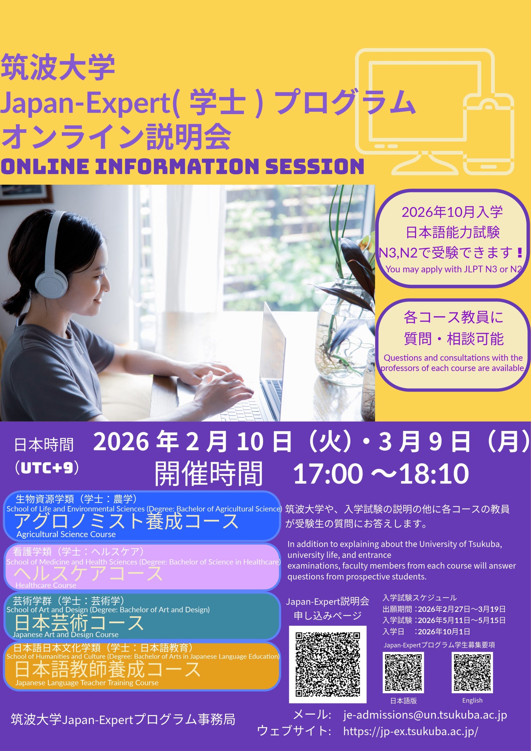 Japan-Expertプログラムオンライン説明会では、筑波大学の概要、大学生活の紹介、入学試験の説明の後、